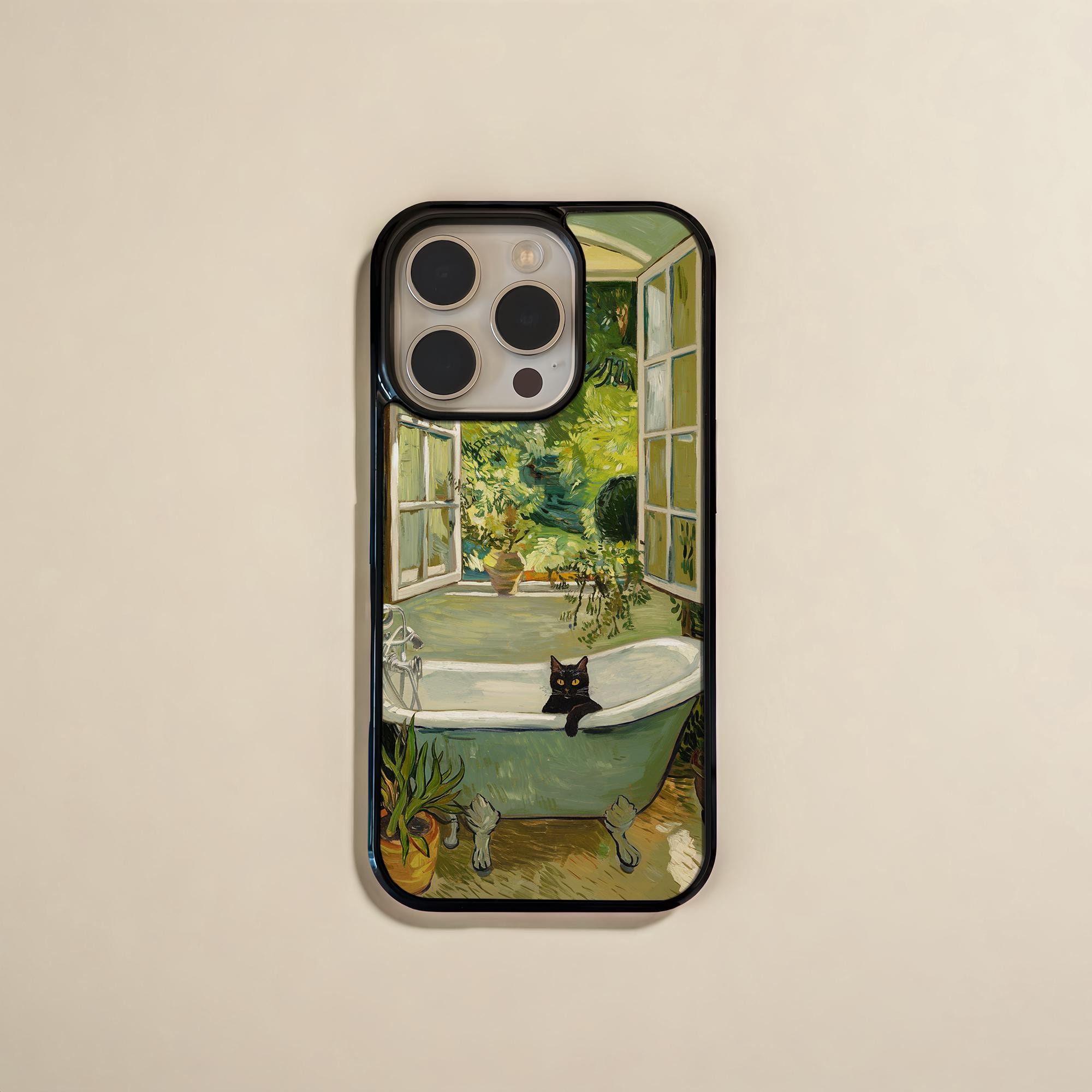 Black Cat Phone Case: Features a black cat in a sunlit bathroom scene with vintage tub, open windows, and greenery. Made with shock-absorbing TPU. Includes anti-glare camera ring and enhanced bumper design for protection. Corner cushion for drop and shock protection. Compatible with wireless charging. UV printed. Artwork created with AI and personal touches.